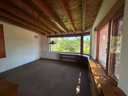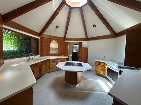 Hall hacia una sala redonda, con cúpula catalana, junta un amplio comedor, ambos con ventanales para disfrutar las vistas Cocina cerrada en forma octagonal, estufa, y una plancha para Teriyaki en el centro sobre una isla.
